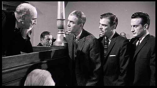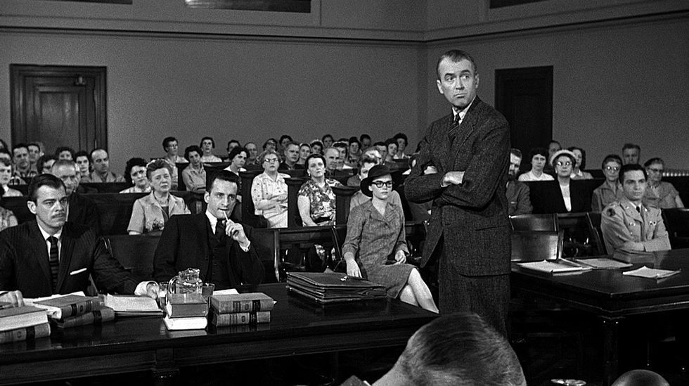 Tenía 12 años cuando pusieron en televisión “Anatomía de un Asesinato” (1959). Recuerdo sentarme sin muchas ganas en el sofá para verla cuando mi padre me dijo que era una peli sobre abogados. Tenía en la cabeza esas aburridas pelis en la que los abogados eran siempre muchachos jóvenes que conducían coches carísimos, su pelo estaba engominado hacia atrás, llevaban relojes de oro y gritaban en estrados y, sobre todo, se pasaban casi todo el tiempo engañando a todo el mundo, jactándose precisamente de eso. Eran como la chulería personificada. A mí no me gustaba aquello, a mí no me gustaban los abogados.