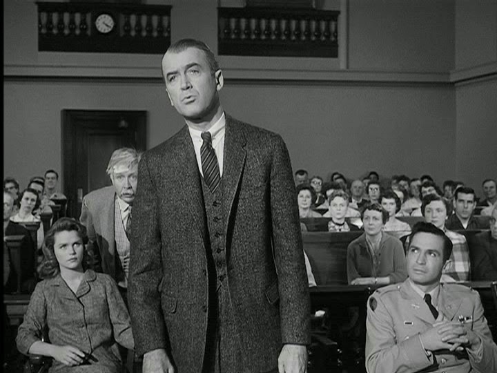 Otra cuestión llamativa es la indumentaria de Biegler. Esos trajes a la vez oscuros y brillantes, sencillos pero que dicen mucho de quien lo lleva. Parece como que el guió se hubiera ajustado al contexto de esas chaquetas. Me convencí de que un auténtico abogado tenía que vestir de manera parecida a como lo hacía Paul Biegler.