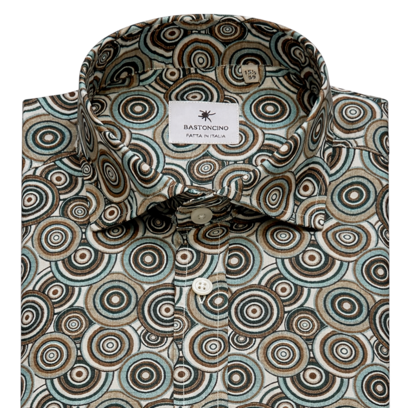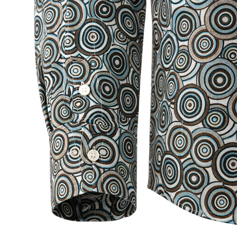 Atrévete con un estilo lleno de personalidad con esta camisa de algodón con estampado retro, inspirada en la estética vibrante de los años 70. Su diseño geométrico con círculos de aire psicodélico evoca el espíritu creativo y nocturno del mítico estilo disco, recordando la atmósfera icónica de los clubes de Nueva York.